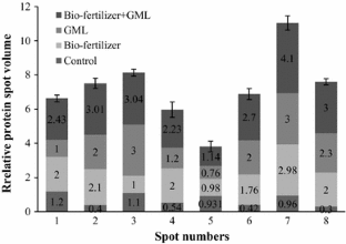 Aluminum (Al) toxicity is one of the primary factors limiting crop production on acid sulfate soils. In the present study, two-dimensional polyacrylamide gel electrophoresis approach (2D-PAGE) was applied to identify Al tolerance, plant growth promotion and separately expressed proteins were determined using mass spectrometry. Seedlings of rice were grown in an acid sulfate soil. Bio-fertilizer containing acid-tolerant and plant growth-promoting bacteria (PGPB) were given alone or in combination with ground magnesium limestone (GML) at 4 t ha−1. Leaf samples were taken at 45 days after transplanting. Results exhibited that the application of bio-fertilizer and GML increased soil pH and leaf chlorophyll content. Highest plant height, root length and tiller number were observed in the modified treatments. A total of eight different proteins have been identified to be differentially expressed in rice leaf tissues by mass spectrometry analysis that exposed the differential expression of certain vital proteins. The identified proteins were involved in tolerating abiotic stress, disease resistance, oxidation–reduction process and internal plant physiological functions. Results of analyzing multiple protein spots have shown their involvement for the promotion of plant development and reduction of Al toxicity. The study thus confirms the primary role of PGPB containing bio-fertilizer with GML on growth of rice under Al toxic conditions in acid sulfate soil.