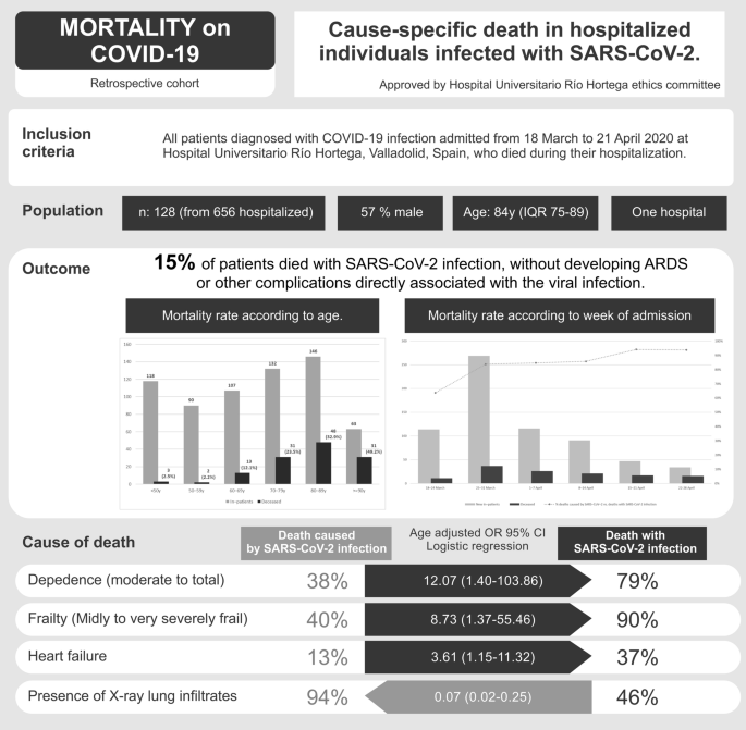 Differences in distributions of patient characteristics by outcome subgroup were reported using differences with 95% CIs. Categorical data were compared using the Chi square test or the Fisher exact test when needed. For crosstabs larger than 2 × 2 of 3 ordinal variables (age, performance in activities of daily living and clinical frailty scale), we used the linear-by-linear association test to assess for trends. Continuous data were compared using Student’s t test or the Mann–Whitney rank sum test with non-parametric variables. ORs adjusted by age are presented with 95% CIs for all the variables associated with the cause of death in univariate analysis. Adjustment by age was done using logistic regression.