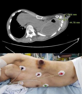 A 27-year-old man with severe pectus excavatum, dextrocardia and spinal scoliosis underwent thoracoscopic pleural decortication due to failure of 1-month medical treatment for tuberculous empyema. One month after the pleural decortication, he again underwent open thoracostomy window for repetitive pleuro-cutaneous fistula with tuberculosis empyema. He was subsequently referred to our clinic for progressive dyspnea and bilateral leg edema 4 months after the open thoracostomy window. Evaluations revealed deterioration of the chest wall depression and further compression of the inferior vena cava, which were considered an aggravation of the pectus excavatum after the open thoracostomy window. Herein, we present an extremely rare case of deterioration of chest wall depression causing congestive hepatopathy after an open thoracostomy window in a patient with pectus excavatum and tuberculosis empyema.