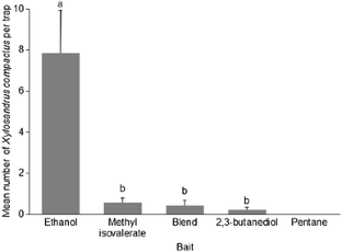 Egonyu, J.P., Torto, B. Responses of the ambrosia beetle Xylosandrus compactus (Coleoptera: Curculionidea: Scolytinae) to volatile constituents of its symbiotic fungus Fusarium solani (Hypocreales: Nectriaceae). Arthropod-Plant Interactions 12, 9–20 (2018). https://doi.org/10.1007/s11829-017-9552-2