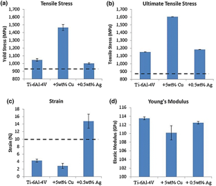 Titanium and titanium alloys used in current medical and dental applications do not possess antibacterial properties, and therefore, postoperative infection remains a significant risk. Recently, the addition of silver and copper to conventional biomaterials has been shown to produce a material with good antibacterial properties. In this article, we investigate selective laser melting as a method of producing antibacterial Ti-6Al-4V containing elemental additions of Cu or Ag. The addition of Ag had no effect on the microstructure or strength, but it did result in a 300% increase in the ductility of the alloy. In contrast, the addition of Cu resulted in an increase in strength but in a decrease in ductility, along with a change in the structure of the material. The Cu-containing alloy also showed moderate antibacterial properties and was superior to the Ag-containing alloy.