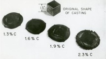 Such was not the case at slower cooling rates. Several attempts were made to cool ingots at slower rates, but large cavity porosity was found in the ingots, which made it nearly impossible to forge them to blade shapes. It seemed most likely that this porosity was due to evolution of CO gas on cooling at the slow rates. Cavity porosity in the slow-cooled ingot 7315 was avoided by adding a borosilicate glass ampoule filled with 1.4 g of Al and 1.4 g of a chloride-based fluxing salt. The glass ampoule plus the fluxing agent prevented the Al from oxidizing before it could dissolve into the melt and thereby prevented CO evolution just as it does in aluminum-killed steels. Table I shows that the carbon composition of ingot 7315 is the same as that of ingot 8115; hence, it has the same liquidus temperature of 1423°C. It was heated to a maximum temperature of 1468°C, held above the liquidus for 108 min and subsequently cooled through the dendrite growth range at an average rate of around 1°C/min. There was no cavity porosity in this slow-cooled ingot.