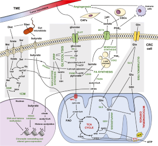 Changes in cellular metabolism may precede the acquisition of driver mutations ultimately leading to colonocyte transformation. Oncogenic mutations and loss of tumor suppressor genes further reprogram CRC cells to upregulate glycolysis, glutaminolysis, one-carbon metabolism, and fatty acid synthesis. These metabolic changes are not uniform throughout tumors, as subpopulations of tumor cells may rely on different pathways to adapt to nutrient availability in the local tumor microenvironment. Finally, metabolic cross-communication between stromal cells, immune cells, and the gut microbiota enable CRC growth, invasion, and metastasis.