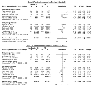 Summarized crude risk estimates showed a small increased T1D risk in children and young adults born through elective CS compared to vaginal delivery, but with significant heterogeneity. Adjusted risk estimates by study design indicated a slightly increased T1D risks associated with elective or non-elective CS.