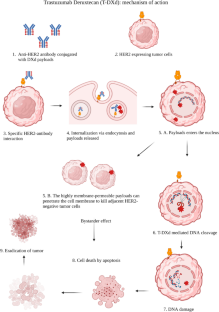 • Ogitani Y, Aida T, Hagihara K, Yamaguchi J, Ishii C, Harada N, et al. DS-8201a, A novel HER2-targeting ADC with a novel DNA topoisomerase I inhibitor, demonstrates a promising antitumor efficacy with differentiation from T-DM1. Clin Cancer Res. 2016;22(20):5097–108. Explains the mechanism of action and the bystander effect that could explain the efficacy of T-DXd in HER2-low and HER2-heterogenous tumors.