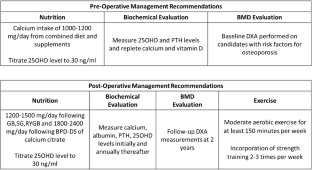 • Muschitz C, Kocijan R, Haschka J, Zendeli A, Pirker T, Geiger C, et al. The impact of vitamin D, calcium, protein supplementation, and physical exercise on bone metabolism after bariatric surgery: the BABS study. J Bone Miner Res. 2016;31(3):672–82. https://doi.org/10.1002/jbmr.2707This study suggested that supplementation and exercise led to smaller increases of sclerostin and CTX levels, and normal intact PTH levels as well as a mitigated decline in lumbar spine, total hip and total body aBMD.