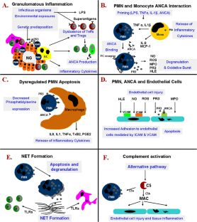 •• Kessenbrock K, Krumbholz M, Schonermarck U, Back W, Gross WL, Werb Z, et al. Netting neutrophils in autoimmune small-vessel vasculitis. Nat Med. 2009;15(6):623–5. Neutrophil extracellular traps (NETs) are released by ANCA-stimulated neutrophils in the absence of microbial infection and contain proteinase-3 and myeloperoxidase. Deposition of NETs in inflamed tissue suggest that NET formation triggers vasculitis.
