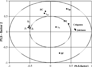 The objective of this work was to evaluate and correlate rheological properties (small-scale dynamic oscillatory and creep/recovery measurements and large-scale compression force-deformation testing), texture (sensory evaluation by trained panel) and structure (optical and transmission electronic microscopy observations) of apples osmotically dehydrated to water activity (a w) 0.97 with glucose, with or without previous blanching. All apple samples showed a solid behavior (G′ > G″) dominating the viscoelastic response, but both dynamic moduli were reduced due to processing. The instantaneous elastic compliance (J 0) and the retarded compliances (J 1 and J 2) increased for treated tissues and the steady-state viscosity (η N) was approximately 15% to 29% of the value of fresh apple. In general, compression parameters decreased for all treated tissues. Changes in structural features were mainly evidenced in heated samples. Partial least squares regression analysis regression models revealed that texture could be well predicted by rheological properties (compression and creep parameters). Juiciness, crispness and sensory hardness were negatively correlated to J 0, J 1 and J 2, and η N was negatively correlated to sensory fracturability. Some mechanical parameters (fracturability, hardness 2, area 2, modulus of deformability and cohesiveness) were positively related to sensory fracturability, crispness and sensory hardness; and juiciness was negatively correlated to hardness. Compression and creep parameters showed ability to evidence structure differences (rupture of membranes, swelling of cells and degradation of cell walls) and to explain texture of treated apples.