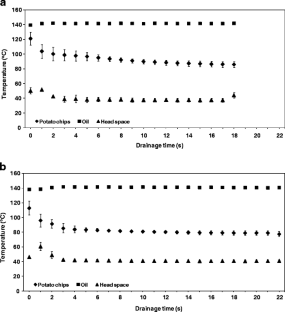 This paper explores the possibility of combining moderate vacuum frying followed by post-frying high vacuum application during the oil drainage stage, with the aim to reduce oil content in potato chips. Potato slices were initially vacuum fried under two operating conditions (140 °C, 20 kPa and 162 °C, 50.67 kPa) until the moisture content reached 10 and 15 % (wet basis), prior to holding the samples in the head space under high vacuum level (1.33 kPa). This two-stage process was found to lower significantly the amount of oil taken up by potato chips by an amount as high as 48 %, compared to drainage at the same pressure as the frying pressure. Reducing the pressure value to 1.33 kPa reduced the water saturation temperature (11 °C), causing the product to continuously lose moisture during the course of drainage. Continuous release of water vapour prevented the occluded surface oil from penetrating into the product structure and released it from the surface of the product. When frying and drainage occurred at the same pressure, the temperature of the product fell below the water saturation temperature soon after it was lifted out of the oil, which resulted in the oil getting sucked into the product. Thus, lowering the pressure after frying to a value well below the frying pressure is a promising method to lower oil uptake by the product.