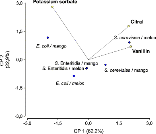 The susceptibility of Escherichia coli, Salmonella enteritidis, Saccharomyces cerevisiae, and Zygosaccharomyces bailii to binary and ternary mixtures of potassium sorbate (KS), vanillin (V), and citral (C) was evaluated according to the Berenbaum experimental design, in laboratory media. For some V/C combinations, KS inhibitory concentrations were determined in agarized melon and mango purées by the spiral gradient endpoint (SGE) method. In laboratory media, inhibitory antimicrobial combinations were generally additives. For the yeasts, some synergistic effects were observed. All Berenbaum mixtures which resulted inhibitory in laboratory media were confirmed in the fruit purées. When the SGE method was used, several inhibitory ternary mixtures were found. The lowest inhibitory KS concentrations, estimated for a given V/C combination, corresponded to the bacteria assayed in melon purée. Z. bailii was not inhibited at any condition. Some synergistic antimicrobial combinations (595 ppm V + 251 ppm C + 8 ppm KS in melon and 280 ppm V + 123 ppm C + 8 ppm KS in mango purées) could be useful to achieve a desired inhibitory effect in fruit purées while reducing their concentrations.