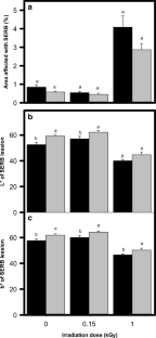 The objective of this study was to determine if oranges in the top and bottom layers within a Standard Place Pack were impacted differently by irradiation after long-term storage. ‘Barnfield’ Navel oranges were packed in Standard Place Pack cartons and treated with 0, 0.15, or 1 kGy of gamma irradiation. The fruit were stored for 3 weeks at 5 °C and then for 1 week at 20 °C. After storage, the fruit from the top and bottom layers were separately evaluated for quality. The development of stem-end rind breakdown (SERB) was the main cause of quality loss and was greater in irradiated fruit in the top layer. Fruit in the bottom layer showed more physical damage (flattening) but lower incidence of SERB. The changes in individual sugar content were minimal but significant for layer. The content of individual organic acids was consistently lower in irradiated fruit from the bottom layer. Layer type showed a stronger effect on phenolic compounds than irradiation dose. The tristimulus color, total soluble solids, titratable acidity, and firmness of fruit were not influenced by irradiation dose or layer type. The results show that damage in irradiated Navel oranges depends on dose and layer, with the top layers showing greater physiological damage and bottom layers showing more physical damage.