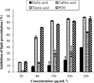 The antioxidant properties of phenolic compounds from olive pulp (PCO) of chamlal variety and those of individual phenolic compounds were evaluated and compared with that of vitamin C (Vit C). The antioxidant activity was measured by the tests of iron reduction and scavenging hydrogen peroxide (H2O2). Results showed that all the substances tested exhibit a reducing power. The PCO present activities of iron reduction and H2O2 scavenging higher than those of Vit C. The protective effect of PCO against oxidation of lipids and proteins from erythrocyte membranes was studied. The measurement of malondialdehyde generated under oxidative stress conditions induced by hydroxyl radicals generating system revealed that PCO have the most significant protective activity against lipid peroxidation (IC50 = 49.27 ± 1.91 μg mL−1). Paradoxically, Vit C revealed a pro-oxidant effect. Proteins oxidation was evaluated using the H2O2/FeSO4 system and electrophoresis. In the presence of PCO at 1 mg mL−1, proteins of erythrocyte membranes were protected contrary to those treated with Vit C at the same concentration.