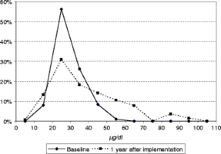 This study was conducted to evaluate the impact of a food aid program (Plan Más Vida, PMV) on the micronutrient nutritional condition of lactating mothers 1 year after its implementation. The food program provided supplementary diets (wheat- and maize-fortified flour, rice or sugar, and fortified soup) to low-income families from the province of Buenos Aires, Argentina. A prospective, non-experimental study was carried out to evaluate the micronutrient nutritional status of lactating mothers (n = 178 at baseline and n = 151 after 1 year). Biochemical tests (hemoglobin, ferritin, zinc, vitamin A, and folic acid), anthropometric assessments (weight and height) and dietary surveys (24-h recall) were performed. We found no significant changes in anthropometric values 1 year after the intervention. The risk for vitamin A (retinol 20–30 μg/dl) and folate deficiency significantly decreased 1 year after PMV implementation (56.3 vs. 29.9 and 50.3 vs. 3.4 %, respectively; p < 0.001). Anemia was seen in 25.8 % of lactating mothers at baseline, without statistically significant differences 1 year after (p = 0.439). The nutritional data obtained after assessing the early impact of PMV actions may be useful to provincial health authorities to perform periodic evaluations in the future.