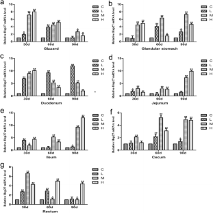 Arsenic (As) is widely distributed in our living environment and is useful for industry, agriculture, medical treatment, and other fields. Arsenic trioxide (As2O3) is an existing form of As. Exposure to As2O3 has a toxic effect on humans and animals. It not only leads to skin cancer, peripheral vascular disease, hyperkeratosis, etc. but also interferes with the functioning of the gastrointestinal tract. The gastrointestinal tract is an important organ for animals to transform the food they eat into the nutrients their body needs for maintenance and growth. Heat shock proteins (Hsps) exist in the non-stress normal cells and their expression increases under stimuli. Therefore, we wonder whether the “stimulus” of As2O3 could change the messenger RNA (mRNA) abundance and expression level of Hsps in the gastrointestinal tract of birds. To investigate the relation between arseniasis and Hsp alterations in the chicken’s gastrointestinal tract induced by an As2O3-supplemented diet, we selected 72 one-day-old male Hy-line chickens and randomly divided them into four groups. They were fed either a commercial diet or an As2O3-supplemented diet containing 7.5, 15, and 30 mg/kg As2O3. The experiment lasted for 90 days, and gastrointestinal tract tissue samples (gizzard, glandular stomach, duodenum, jejunum, ileum, cecum, and rectum) were collected at 30, 60, and 90 days. The mRNA contents of Hsps (including Hsp27, Hsp40, Hsp60, Hsp70, and Hsp90) were examined by real-time PCR (RT-PCR). The correlation between As2O3 and Hsp genes was assessed. In addition, the protein expression levels of Hsp60 and Hsp70 in the gastrointestinal tract tissue samples were measured by western blot. The results indicated that the mRNA expression levels and the Hsp expression levels in the gastrointestinal tract tissues of chickens with As2O3 supplementation increased at different time points in a dose-dependent manner (p < 0.05 or p < 0.01). These data suggested that arseniasis influenced the mRNA abundance of Hsp27, Hsp40, Hsp60, Hsp70, and Hsp90 and the protein expression levels of Hsp60 and Hsp70 in the chicken’s gastrointestinal tract tissues.