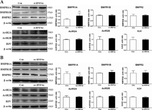 HNF-4α has no effect on the synthesis of novel BMPR1A ligands. Protein levels of BMP2, BMP4, BMP6, and BMP7 were detected by Western blotting (BMP2: Proteintech, USA; 1:1000 dilution; BMP4: BBI, China; 1:1000 dilution; BMP6: BBI, China; 1:1000 dilution; BMP7: Proteintech, USA; 1:1000 dilution) in HepG2 cells transfected with invalid negative control siRNA (Con) or specific HNF-4α siRNA (si-HNF4α), or in empty HepG2 cells transfected with empty control plasmids (Con) or plasmids encoding HNF-4α (oe-HNF4α). Values are expressed as mean ± S.E.M., determined in three independent experiments. Statistical difference between two groups was assessed by the Independent-t test. (DOCX 278 kb)