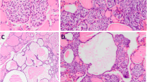 Thyroglossal duct cysts, lingual thyroid remnants, and SCNs are believed to harbor pluripotent stem cells [2, 3, 7]. Solid cell nests are composed of two cell types: “main cells” and “C cells” [3]. Main cells, which account for a major proportion of SCNs, are polygonal-to-elongated cells with centrally located, oval nuclei; they have uneven nuclear envelopes and occasionally display strongly eosinophilic cytoplasm with squamoid features (including high molecular weight cytokeratins) but lack intercellular bridges [3]. The minority C cells are characterized by clear cytoplasm and small, compact, centrally located nuclei [2–4]. In up to 81% of cases, mixed follicles may be found admixed with bona fide SCNs [2–4]; these are composed of cells resembling main cells and differentiated follicular cells arranged in a follicular lumen-like pattern.