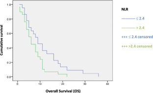 The median age was 55. Male to female ratio was 1:1. Forty-seven patients were smokers. Most of the patients (93.4%) had good performance status (ECOG 0-2). Forty-six patients had gastric and 15 had gastro-esophageal cancer. 50.8% had diffuse gastric type. Grade III represented 49.2% and grade II 46%. Twelve patients had ascites at diagnosis. Stage at presentation was 1.6%, 4.9%, 27.9%, 50.8%, and 14.8% for stage I, II, III, IV, and unknown respectively. The median NLR was 2.4. The NLR showed no significant correlation with different clinic-epidemiologic and pathological variables except presence of ascites; p = 0.046. Median event-free survival (EFS) and overall survival (OS) were 6 and 8 months respectively. High NLR was significantly associated with worse survival; EFS, 5 months vs 8 months (95% CI, p = 0.001). OS, 6 months vs 9 months (95% CI, p = 0.013).