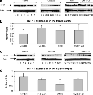 Depression is associated with hippocampus (HC) volume loss. Chronic mild stress (CMS) in rats is a model of depression. Antidepressants attenuate HC volume loss and reverse the depression-like symptoms of stressed animals. We evaluated the effect of CMS and the selective serotonin reuptake inhibitor, fluoxetine (FLX) treatment on behavioral and cognitive parameters in rats, and on HC and frontal cortex (FC) neurotrophic factors levels. Male rats were exposed sequentially, over a period of 5 weeks, to a variety of mild stressors. FLX (5 mg/kg/day ip) was administered to the stressed group and controls (unstressed). After 5 weeks of CMS, animals were tested using the Morris Water Maze (MWM). In the MWM, we observed that FLX had a transitory effect on unstressed rats. CMS reduced insulin-like growth factor-1 receptor (IGF-1R) levels in the HC whereas after FLX treatment these levels reverted to normal range. CMS rats revealed a significant decrease in extracellular signal-regulated kinase (ERK) phosphorylation in both HC and FC regions, while FLX normalized these levels. This study suggests that IGF-1R and ERK may have a role in mediating the neural stress response and the mode of action of FLX. This role seems to be independent of the BDNF alterations.