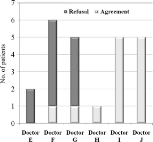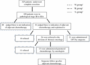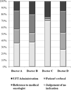 Adjuvant chemotherapy improves the prognosis of patients with non-small-cell lung cancer (NSCLC) treated by complete resection. At Shizuoka Cancer Center, thoracic surgeons evaluate the indications for adjuvant chemotherapy, and once a patient is judged as suitable for adjuvant chemotherapy, uracil-tegafur (UFT) is prescribed by them mainly in cases of stage IB, or the patient is referred to a medical oncologist for parenteral chemotherapy mainly in cases of stages IIA to IIIA. However, both the medical oncologists and the surgeons at our institute often encounter differences in attitudes toward adjuvant chemotherapy among them. One hundred and nine patients with NSCLC, of pathological stages IB to IIIA, who underwent complete resection at our institute, between April 2005 and June 2007, were recruited for this study. By reviewing medical charts of the patients and interviewing medical oncologists and surgeons at our institute, we mainly analyzed the differences in the judgment of the patients’ suitability for adjuvant chemotherapy among surgeons and the differences in the proportion of patients who agreed to the adjuvant chemotherapy recommended by the medical oncologists. The proportion of patients judged as unsuitable for adjuvant chemotherapy by one surgeon was higher when compared with that by the other three surgeons. While all patients who were referred to two medical oncologists agreed to the adjuvant chemotherapy, few patients referred to the other medical oncologists agreed. This study revealed that there were considerable differences in whether patients consented to adjuvant chemotherapy depending on the medical oncologists that they were referred to, and suggested possible differences in the judgment of the patients’ suitability for adjuvant chemotherapy among surgeons.