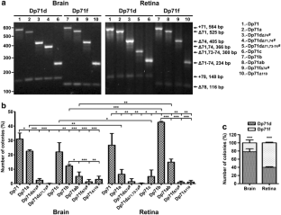Multiple dystrophin Dp71 isoforms have been identified in rats, mice, and humans and in several cell line models. These Dp71 isoforms are produced by the alternative splicing of exons 71 to 74 and 78 and intron 77. Three main groups of Dp71 proteins are defined based on their C-terminal specificities: Dp71d, Dp71f, and Dp71e. Dp71 is highly expressed in the brain and retina; however, the specific isoforms present in these tissues have not been determined to date. In this work, we explored the expression of Dp71 isoforms in the mouse brain and retina using RT-PCR assays followed by the cloning of PCR products into the pGEM-T Easy vector, which was used to transform DH5α cells. Dp71-positive colonies were later analyzed by PCR multiplex and DNA sequencing to determine the alternative splicing. We thus demonstrated the expression of Dp71 transcripts corresponding to Dp71, Dp71a, Dp71c, Dp71b, Dp71ab, Dp71 Δ110, and novel Dp71 isoforms spliced in exon 74; 71 and 74; 71, 73 and 74; and 74 and 78, which we named Dp71d Δ74 , Dp71d Δ71,74 , Dp71d Δ71,73–74 , and Dp71f Δ74 , respectively. Additionally, we demonstrated that the Dp71d group of isoforms is highly expressed in the brain, while the Dp71f group predominates in the retina, at both the cDNA and protein levels. These findings suggest that distinct Dp71 isoforms may play different roles in the brain and retina.