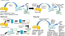 Cultured normal human astrocytes internalized fluorescently labeled EVs released by established (U87MG) and primary (JK2-stem) GBM cells (Fig. 2a–c). Mechanisms of EV uptake are not well defined but several routes are likely, including receptor binding, fusion, and endocytosis [37, 38]. Astrocytes were incubated with GBM-EVs in an invadopodia assay to determine the effects on astrocyte migration (podosome formation) and ECM degradation (Fig. 2d). Areas of gelatin degradation were associated with astrocyte membrane protrusions, observed by FITC-phalloidin staining of F-actin cytoskeleton (Fig. 2d). Invadopodia and podosomes are specialized actin-based, dynamic cell membrane protrusions that degrade the ECM to facilitate cell migration/invasion. While the terms are used interchangeably, by definition invadopodia are described in cancer cells while podosomes are found on normal motile cells [39]. Normal astrocytes exposed to GBM-EVs showed significantly enhanced gelatin degradation ability relative to untreated cells; the greatest increases were observed in astrocytes exposed to WK1 and JK2 stem EVs (6.5-fold and 4-fold increases, respectively). WK1-diff and JK2-diff EVs also induced astrocytes to degrade the gelatin matrix (both by 2.2-fold); however, this effect was significantly lower than that produced by parent stem cell EVs (stem vs. diff: 2.9-fold, p = 0.0007 and 1.8-fold, p = 0.0292, for WK1 and JK2 EVs, respectively; Fig. 2e and Supplementary Table 3). This trend was not observed for RN1, where stem and diff EVs both increased astrocyte gelatin degradation by 2.4-fold (p < 0.002). U87MG-EVs increased astrocyte podosome formation and matrix degradation with borderline significance (2.1-fold, p = 0.051). These findings indicate that GBM-derived EVs induce ECM degradation by increasing podosome formation in normal astrocytes. Our observations are corroborated by a recent study showing an induction in astrocyte migration (wound-healing assay) following exposure to GSC-like EVs [40]. In a co-culture experiment, U87MG cells were shown to activate astrocytes and mediate the breakdown of basement membranes and facilitate tumor cell invasion [5]. BBB dysfunction is a pathological feature of GBM [41]. Glioma cells displace astrocytes from blood vessels and are proposed to induce vasoconstriction to increase the perivascular space to facilitate tumor invasion [1]. Single invasive glioma cells were shown to invade faster along cerebral microvessels and stimulate vascular remodeling and angiogenesis specifically at sites of contact with malignant cells [42]. The loss of astrocyte-vascular contact is also anticipated to have significant implications for the transport and storage of energy metabolites [43, 44]. Remodeling of astrocyte projections induced by GBM-EVs may, therefore, contribute to glio-vascular uncoupling, promote GBM spread, and support the growing metabolic needs of enhancing tumors. Further studies employing in vitro BBB models as well as profiling astrocyte secretomes and metabolomes after GBM-EV exposure may support these ideas.
