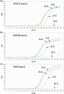 Contiguous microdeletions of the Norrie disease pseudoglioma (NDP) region on chromosome Xp11.3 have been widely confirmed as contributing to the typical clinical features of Norrie disease (ND). However, the precise relation between genotype and phenotype could vary. The contiguous deletion of NDP and its neighbouring genes, MAOA/B and EFHC2, reportedly leads to syndromic clinical features such as microcephaly, intellectual disability, and epilepsy. Here we report a novel contiguous microdeletion of the NDP region containing the MAOB and EFHC2 genes, which causes eye defects but no cognitive disability. We detected a deletion of 494.6 kb at Xp11.3 in both the proband and carrier mother. This deletion was then used as the molecular marker in prenatal diagnosis for two subsequent pregnancies. The deletion was absent in one of the foetuses, who remain without any abnormalities at 2 years of age. The proband shows the typical ocular clinical features of ND including bilateral retinal detachment, microphthalmia, atrophic irides, corneal opacification, and cataracts, but no symptoms of microcephaly, intellectual disability, and epilepsy. This familial study demonstrates that a deficiency in one of two MAO genes may not lead to psychomotor delay, and deletion of EFHC2 may not cause epilepsy. Our observations provide new information on the genotype–phenotype relations of \({\textit{MAOA/B}}\) and EFHC2 genes involved in the contiguous deletions of ND.