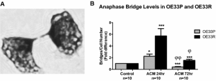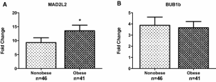 OE33R and OE33P were cultured with adipose-conditioned media derived from oesophageal adenocarcinoma patients (n = 10). Anaphase bridges, a marker of genomic instability, were enumerated in both cell lines following treatment with adipose media, and normalised to cell number. Genomic instability is regulated by the spindle assembly complex. Expression of two spindle assembly complex genes (MAD2L2, BUB1B) was assessed using qPCR, and validated in patient tumour specimens from viscerally obese (n = 46) and nonobese patients (n = 41).