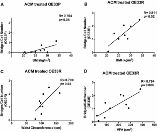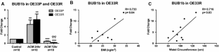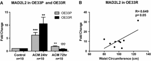 Adipose-conditioned media increased anaphase bridging in OE33R (p < 0.0001), with a threefold increase in OE33R compared to OE33P (p < 0.01). Levels of anaphase bridges in OE33R cells correlated with visceral obesity status as measured by waist circumference (R = 0.709, p = 0.03) and visceral fat area (R = 0.794, p = 0.006). Adipose tissue altered expression of MAD2L2 in vitro. In vivo, MAD2L2 expression was higher in viscerally obese oesophageal adenocarcinoma patients compared with nonobese patients (p < 0.05).