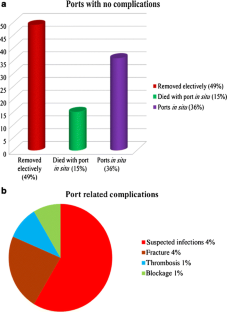 A total of 100 ports were placed in 99 patients. The mean duration of the implantable ports was 393 days (range 30–1300). In 49 cases (49%), ports were removed electively, 15 cases (15%) died with port in situ and 36 cases (36%) still have port in situ and receiving chemotherapy without any complications. Complications observed were suspected infection (4%), port fracture (4%), thrombosis of catheter (1%) and blockage (1%).