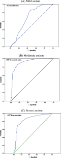 The CARS total score for mild, moderate and severe autism ranged from 30.5 to 35, 35.5–40 and ≥40.5 respectively in this study. The overall diagnostic accuracy of CARS total score in the mild range was moderate [AUC = 0.68 (95%CI = 0.62–0.88), z = 1.34; P = 0.18], moderate range was high [AUC = 0.90 (95%CI = 0.77–0.97), z = 8.62; P = 0.0001] and severe range was also high [AUC = 0.85 (95%CI = 0.77–0.90), z = 7.09; P = 0.0001].