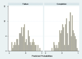 Specifically, the regression framework is used to compare group mean differences in the explanatory variables using the series of dummy variables described above. For thoroughness, no differences in any of the observed variables were found when comparisons were made on the sample restricted to only those expected to succeed and only expected to fail.
