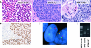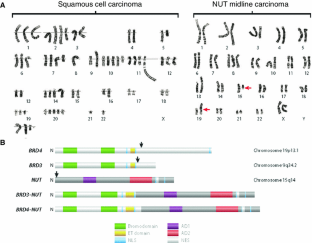 NUT midline carcinoma (NMC) is an aggressive subset of squamous cell carcinoma, genetically defined by rearrangement of the NUT gene. The rearrangements most often take the form of BRD4-NUT fusions, and in a minority of cases, BRD3-NUT or NUT-variant fusions. The simple karyotypes of NMCs, in contrast to the complex ones of typical squamous cell carcinoma, suggest an alternate, genetic shortcut to squamous cancer. Although originally thought to be a disease of the mediastinum, NMC frequently (35 %) arises in the head and neck. Diagnosis is made simply by demonstration of nuclear immunoreactivity to NUT protein, and ancillary studies to characterize the fusion oncogene, though not required for diagnosis, are recommended. The prognosis is dismal, with a 6.7 month median survival, and treatment with conventional chemotherapeutic regimens is ineffective. The oncogenic mechanism of the dual bromodomains and the p300-binding portion of BRD4-NUT is to sequester p300 to localized regions of chromatin, leading to global transcriptional repression and blockade of differentiation. Two therapies which target this mechanism have emerged, including bromodomain inhibitors (BETi) and histone deacetylase inhibitors (HDACi), both of which induce differentiation and growth arrest of NMC cells, both in vitro and in vivo. BETi is available to adults with NMC through a phase I clinical trial, and clinical response to HDACi has been demonstrated in pediatric patients. The emergence of these promising targeted therapies gives hope that NMC may one day be effectively treated and provides a strong rationale for diagnostic testing for NMC.