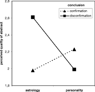The present paper investigated whether academic psychologists show a tendency to rate the quality and appropriateness of scientific studies more favorably when results and conclusions are consistent with their own prior beliefs (i.e., confirmation bias). In an online experiment, 711 psychologists completed a questionnaire (e.g., about their belief in astrology) and evaluated research that was presented in form of a short abstract in which 40 different behaviors (e.g., alcohol consumption, willingness to share money) have been tried to be predicted. The research to be evaluated varied on three dimensions which were all manipulated between subjects: (1) the predictors of the 40 behaviors (either Big Five or astrological factors), (2) the methodological quality of the study (low, medium, high), and (3) the results and subsequent conclusion of the study (confirmation or disconfirmation of the hypotheses). Factor-analyzed scores of participants’ ratings on 8 scales, resulting in 2 factors termed quality and appropriateness, served as dependent measures. The main result of the study is a two-way interaction: Psychologists tended to evaluate results qualitatively higher when they conformed to their own prior expectations, as in this case, when astrological hypotheses were disconfirmed.