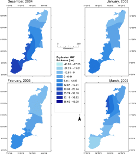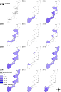 The Indian Ocean Tsunami of December 26, 2004 devastated coastal ecosystems across South Asia. Along the coastal regions of South India, increased groundwater levels (GWL), largely caused by saltwater intrusion, infiltration from inundated land, and disturbance of freshwater lenses, were reported. Many agencies allocated funding for restoration and rehabilitation projects. However, to streamline funding allocation efforts, district-level groundwater inundation/recession data would have been a useful tool for planners. Thus, to ensure better preparedness for future disaster relief operations, it is crucial to quantify pre- and post-tsunami groundwater levels across coastal districts in India. Since regional scale GWL field observations are not often available, this study instead used space gravimetry data from NASA’s Gravity Recovery and Climate Experiment (GRACE), along with soil moisture data from the Global Land Data Assimilation Systems (GLDAS), to quantify GWL fluctuations caused by the tsunami. A time-series analysis of equivalent groundwater thickness was developed for February 2004–December 2005 and the results indicated a net increase of 274 % in GWLs along coastal regions in Tamil Nadu following the tsunami. The net recharge volume of groundwater due to the tsunami was 16.8 km3, just 15 % lower than the total annual groundwater recharge (19.8 km3) for the state of Tamil Nadu. Additionally, GWLs returned to average within 3 months following the tsunami. The analysis demonstrated the utility of remotely sensed data in predicting and assessing the impacts of natural disasters.