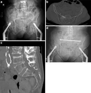 • Gardner MJ, Routt MLC. Transiliac-transsacral screws for posterior pelvic stabilization. J Orthop Trauma. 2011;25(6):378–84. In this case series including patients with osteoporosis and insufficiency fractures the surgical technique and clinical experience using transiliac-transsacral screws is reported. The important points to note are greater screw length assists in distributing the load and resisting vertical shear forces, the holding power is increased by the additional screw threads, and that anchoring the screw in iliac cortical bone aids in maintenance of reduction. This technique is the mainstay of our surgical management of these patients..