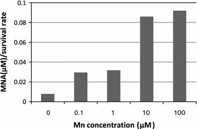 The survival rate of MS cells decreased significantly with increasing concentrations of Mn in the culture medium. With respect to the influence of Mn on NNMT activity, NNMT activity increased significantly at Mn concentrations of 1 μmol/mg protein. MNA and NA neurotoxicity were compared by comparing cell survival rate. Cell survival rate dropped significantly when the cells were cultivated with 10 mM of MNA. There was also a tendency for the survival rate to fall following the addition of 10 mM NA; however, the difference with the control was not significant.