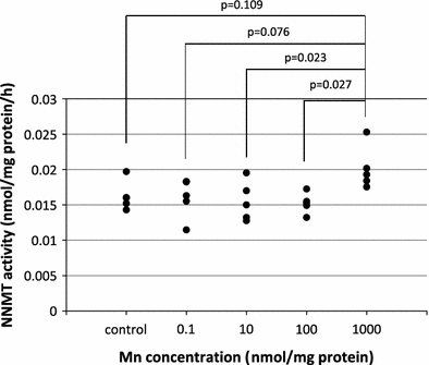 The effect of different Mn concentrations on nicotinamide N-methyltransferase (NNMT) activity. NNMT activity is shown as nmol/mg protein/h (n = 5). All values for each Mn concentration were plotted. Each p value comparison between groups is shown
