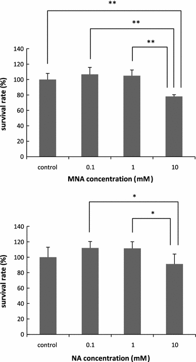The effect of MNA and nicotinamide (NA) on MS cell survival. Survival rate is shown as the percentage of the control. Data are presented as the mean ± SD (n = 6). Double asterisks Significant difference at p < 0.01 between indicated groups, single asterisks significant difference at p < 0.05 between indicated groups