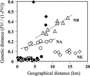 Rousset, F. 1997. Genetic differentiation and estimation of gene flow from F-statistics under isolation by distance. Genetics 145: 1219–1228.