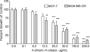 Ryanodine receptors (RyRs) have been previously implicated in the proliferation of human T-lymphocytes and melanocytes as well as in the motility of astrocytes. We have examined RyR expression in 57 ductal, human breast cancer specimens, by immunohistochemistry. Moderate to high RyR immunostaining was found in 47 (82%) of the specimens. There was a direct correlation between RyR levels and tumor grade (r = 0.48, p = 0.0002). We have also examined the effect of the RyR agonist 4-chloro-m-cresol on the in-vitro growth of two human breast cancer cell lines, MCF-7 and MDA-MB-231. Treatment with 4-chloro-m-cresol inhibited the growth of both breast cancer cell lines, in a dose-dependent manner, with half-maximal inhibition observed at 30 to 50 μg/mL (210–351 μM). Our data suggest that RyR could serve as prognostic indicator and/or as a target for breast cancer treatment.