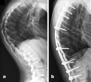 There were six females and 12 males. Mean age of the patients was 22.4 years (range 17–38). Mean kyphosis angle before surgery was 87.2° (range 85–105), and that reduced to 47.4° (range 45–55) after the surgery. Mean curve size in hyperextension view was 73.8°. Mean postoperative Cobb angle was 50–55 percent of preoperative curves. Mean hospital admission duration was 3.5 days after the index surgery (range 3–5 days). Mean blood loss during the surgery was 250 ml. Mean surgical duration time was 150 min. Mean follow-up period was 9 months (range 8–48 months). No complication was found among the patients.