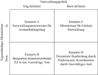 Eine eng verstandene Entwicklungspolitik, die sich auf die Kooperation mit der schrumpfenden Gruppe der ärmsten Länder konzentriert, wird in Zukunft die Rechtfertigung eines Entwicklungsministeriums erschweren. Eine weiter verstandene Entwicklungspolitik, die auch globale Entwicklungsprobleme mit bedeutenden Nicht-OECD-Ländern bearbeitet, übersteigt demgegenüber die Handlungsmöglichkeiten des existierenden Ministeriums. Ein Szenario besteht daher in der Neugründung eines „Ministeriums für Globale Entwicklung“ zur Stärkung derGlobal-Governance-Kapazitäten Deutschlands in Feldern globaler Entwicklung.