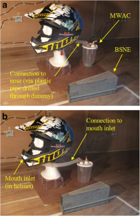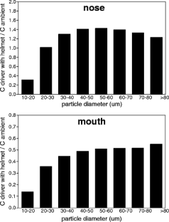 Wind tunnel experiments were performed to investigate how the presence of a driver wearing a motorcycle helmet affects the airborne dust concentration near the driver’s nose and mouth relative to the ambient dust concentration. Data were collected for different grain size fractions of dust ranging from less than 20 μm to approximately 100 μm. The wind tunnel data were also applied to a field experiment with motorcycles and quads. Results show that the presence of a driver wearing a helmet significantly affects dust concentration. For the helmet tested, the concentration at the mouth position was about 50 % lower than the ambient concentration. At the nose position, the concentration depended on the particle size considered. For fine particles (smaller than approximately 30 μm), the dust concentrations at the nose position were lower than the ambient concentrations, similar to the situation near the mouth. For particles larger than 30 μm, which represent most dust released during typical off-road driving on natural surfaces, the dust concentration at the nose position was higher than the ambient concentration. The reason is most probably the chin guard of the helmet, which disturbs the trajectory of the dust particles and brings many particles to a higher elevation as they flow over the chin guard. Most helmets currently on the market have a chin guard and will behave similarly to the one tested in this study. Applying the wind tunnel results to the field experiment showed that the dust concentrations near the nose of the driver were more than 10 % higher than the ambient concentration, but only for particles coarser than 30 μm. For finer particles, they were lower, up to 70 % lower for particles smaller than 20 μm. On the other hand, the dust concentration near the mouth was significantly lower than the ambient concentration, less than half for all particle size classes investigated. This study shows that the effect of wearing a helmet should be taken into consideration when calculating human exposures to airborne dust.