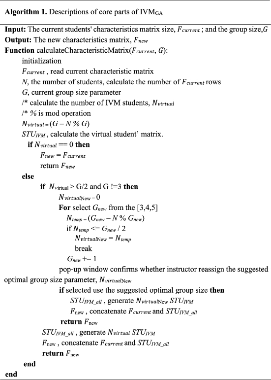 In this step, IVMGA is used to generate students’ global characteristic matrix (see Algorithm 1). Then, the IVMGA uses the global characteristic matrix to generate a group population that includes many random group methods. Next, a fitness function will assess these group methods to find the better group genes and process crossover and mutation operation. This is an iterative process to find a better grouping scheme, and this process ends with the maximum iterations.