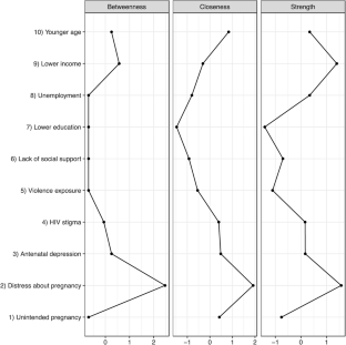 Two hundred pregnant HIV-positive women attending antenatal care in South Africa were enrolled. Measured risk factors included younger age, low income, low education, unemployment, unintended pregnancy, distress about pregnancy, antenatal depression, internalized HIV stigma, violence exposure, and lack of social support. Network analysis between risk factors was conducted in R using mixed graphical modeling. Centrality statistics were examined for each risk node in the network.