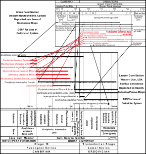 Miller, J. F., Evans, K. R., Freeman, R. L., Ripperdan, R. L., & Taylor, J. F. (2011). Proposed stratotype for the base of the Lawsonian Stage (Cambrian Stage 10) at the First Appearance Datum of Eoconodontus notchpeakensis (Miller) in the House Range, Utah, USA. Bulletin of Geosciences, 86(3), 595–620.