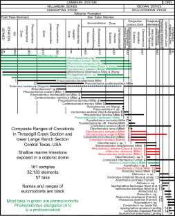 Taylor, J. F., Repetski, J. E., Loch, J. D., & Leslie, S. A. (2012). Biostratigraphy and chronostratigraphy of the Cambrian–Ordovician Great American Carbonate Bank. Chapter 3 In J. R. Derby, R. D. Fritz, S. A. Longacre, W. A. Morgan, & C. A. Sternbach, (Eds.), The Great American Carbonate Bank, American Association of Petroleum Geologists, Memoir, 98, 15–35.