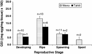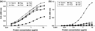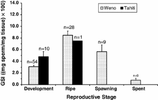 We have developed immunological probes to quantify eggs and sperm of the Black-lip pearl (BLP) oyster Pinctada margaritifera. The western blot assay revealed that the polyclonal antibodies developed in this study specifically recognized only egg and sperm proteins. These polyclonal antibodies also showed high sensitivities to the antigens, detecting 0.31–10 μg/ml of the egg or sperm proteins in an indirect enzyme-linked immunosorbent assay (ELISA). Accordingly, we used an indirect ELISA to quantify the eggs and sperm in BLP oysters collected in December 2009 from Weno Island in Micronesia and in May 2010 from Tahiti. The gonad somatic index (GSI), a ratio of gonad weight to somatic tissue weight, of the females collected from Weno Island ranged from 3.6 to 18.4 %, while the GSI of the females collected from Tahiti ranged from 5.6 to 12.6 %. Similarly, the GSI of the male BLP oysters from Weno Island ranged from 0.8 to 8.5 %, while the GSI of the males from Tahiti ranged from 4.8 to 7.5 %. These results lead to the conclusion that the immunological probes developed in this study can be successfully applied to quantify BLP oyster gonadal tissues and that these probes can be used in studies of BLP oyster reproductive ecology based on their sensitivity, rapidity, and affordability.