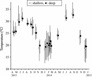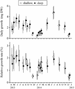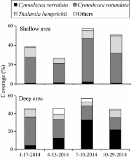 We estimated the leaf growth of the tropical–subtropical seagrass species Cymodocea serrulata using the conventional leaf-marking method in a subtropical seagrass bed on Ishigaki Island, southern Japan, which is near the northern distributional limit of this species. This survey was conducted over an annual cycle at two sites. The deep site was located in a dense meadow in the subtidal zone. The shallow site was located around the lowest part of the intertidal zone, forming a tide pool during ebb tides of the spring tide, which was considered to approximate the upper depth limit of C. serrulata. The relationships between temperature and shoot weight, and the number of leaves per shoot were significantly influenced by site, resulting in a lower biomass in the shallow site. Leaf growth and shoot length increased with temperature without any spatial variation. Leaf growth and the number of leaves per shoot particularly declined during periods of low temperature in both sites. These results suggest that leaf growth and phenology of C. serrulata in this subtropical area are largely regulated by temperature.