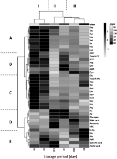 Extractive components of live mussels during ice storage for 13 days were investigated to determine changes in the quality of the mussels. The quality of live mussels was estimated using a taste active value (TAV), an equivalent umami concentration (EUC), and a hierarchical cluster analysis heat map, which were calculated from the extractive components. The extractive components with TAV greater than 1 were glutamic acid, alanine, adenosine monophosphate, and succinic acid during the storage period and aspartic acid up to day 10, whereas the TAV of glycine and inosine monophosphate was less than 1 after day 3. EUCs decreased from 4.38 mg MSG/100 g on day 0 to 3.28 mg MSG/100 g on day 13. Based on the cluster analysis of the metabolite composition and viable bacterial counts, ice-cold live mussels were divided into three clusters: I (days 0–1), II (days 3–10), and III (day 13). Considering not only the decrease in TAV and EUC but also the results of the cluster analysis, it is suggested that live mussels maintain high quality up to the 1st day of ice storage, and thereafter, the quality will be reduced gradually during storage on ice.